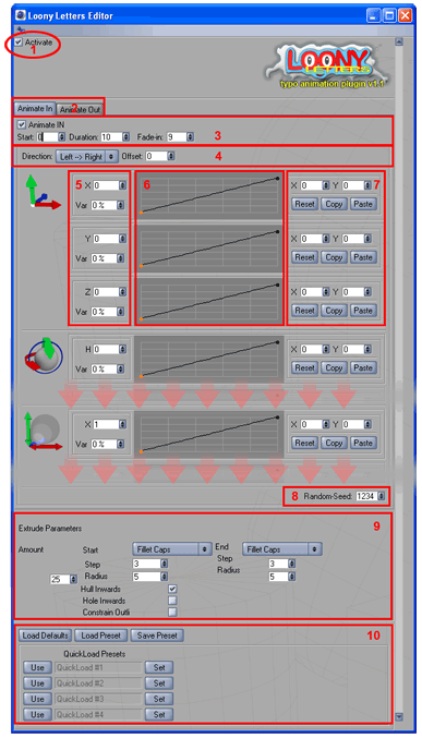 Das Dialogfenster von Loony Letters. Zur bessern Übersicht werden nur von den Positionsparametern alle Werte (XYZ) dargestellt. Bei der Rotation und Skalierung sind nur die jeweils ersten Werte angezeigt. |